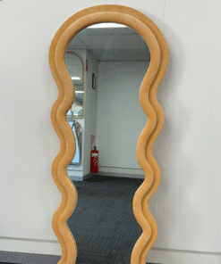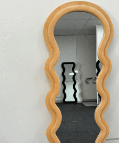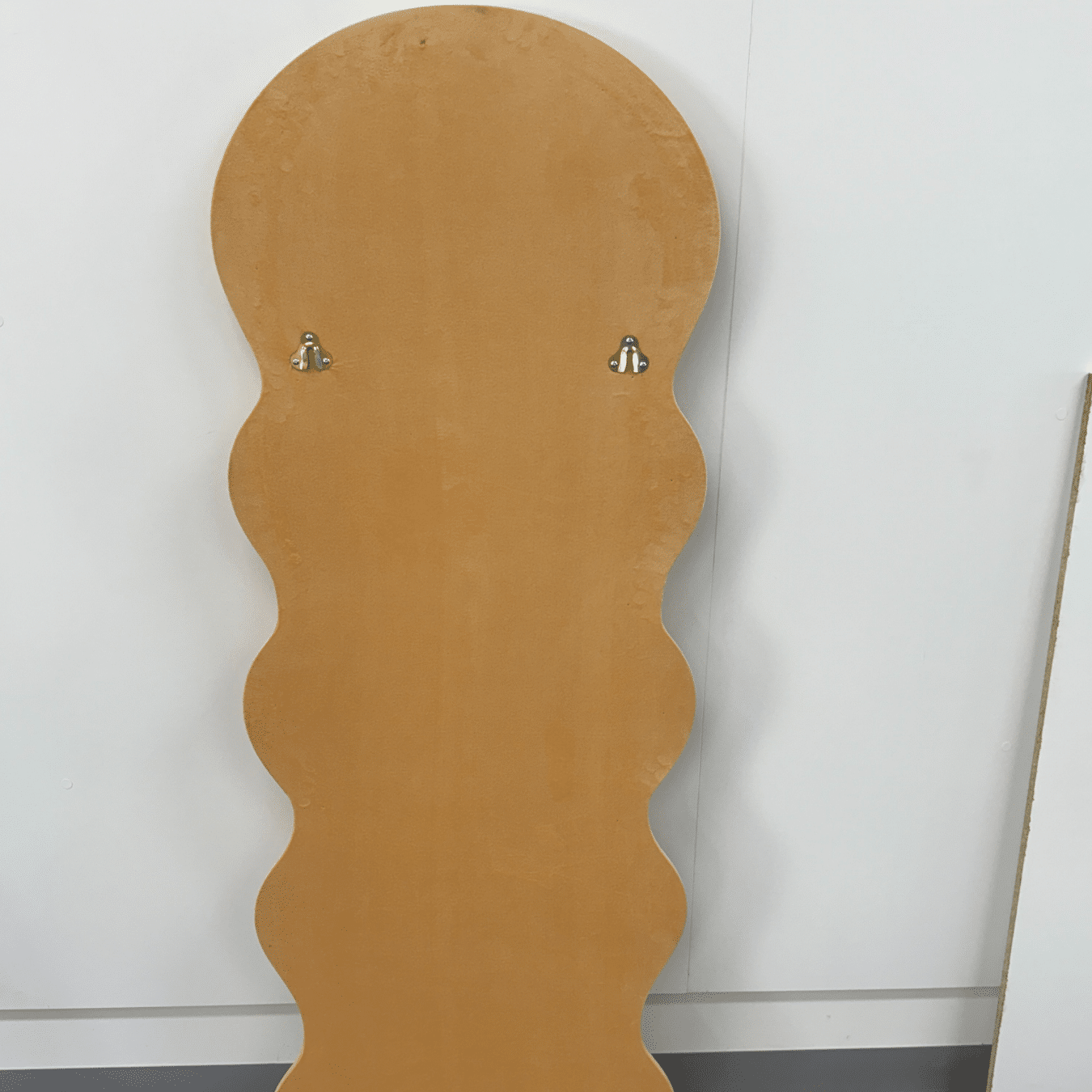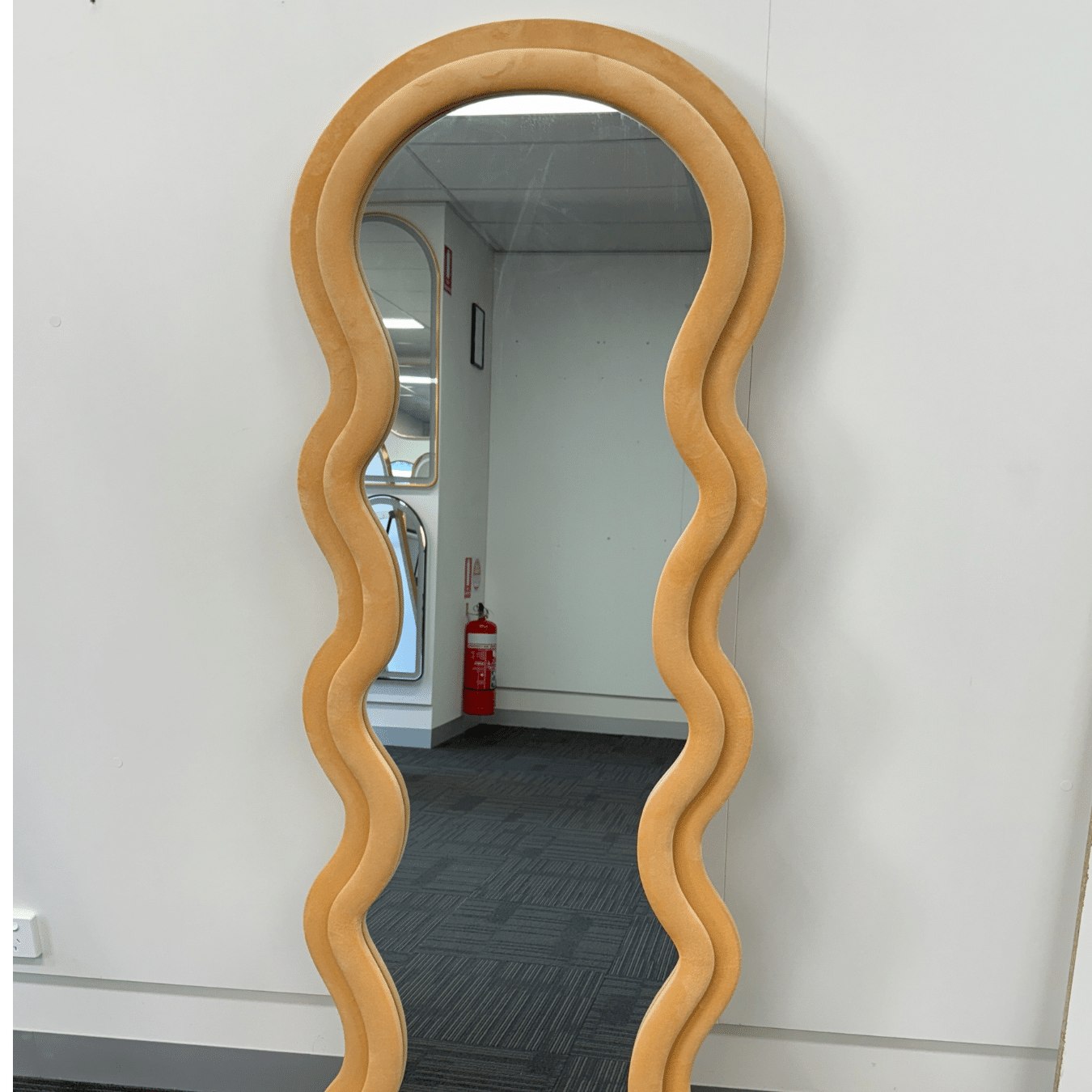 The Modern Arched Wavy Velvet Full Length Mirror in peach-orange colour offers a sophisticated blend of softness and contemporary design. Featuring a graceful arched top combined with a playful wavy frame, wrapped in plush beige teddy velvet, this mirror adds warmth, movement, and elegance to any interior.
